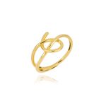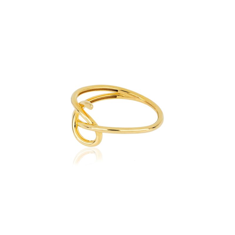 Anel de ouro amarelo 18k com topo formado por curvas e aro duplo parcial.